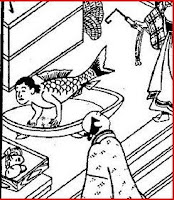 The narrator is present in all of the plays, describing the action and setting and passage of time, inserting songs and poems and wisdom. He is often the only actor, so he also does the voices of all of the puppets as well. I have to imagine the painted scenes, the multi-jointed puppets and their movements, the puppeteers in their trench, and, hopelessly, the music. I also have to imagine the weeping audience.