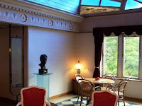 Also, paintings of cats. And books about cats. One of these is called Cats for Pleasure and Profit. The architectural details of the building, such as window frames, sometimes incorporate cat designs, although I could not get a good picture of any of them. No living cats, though.